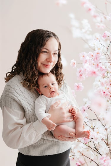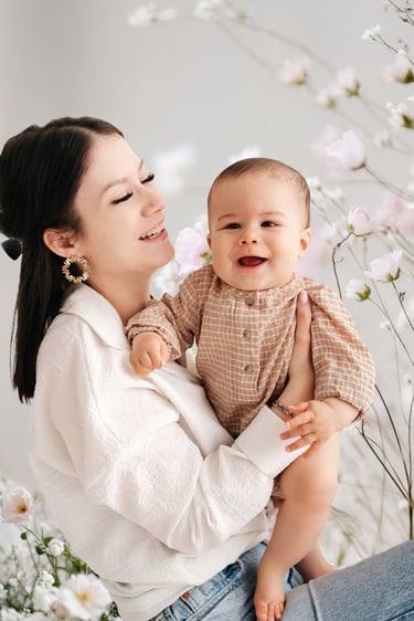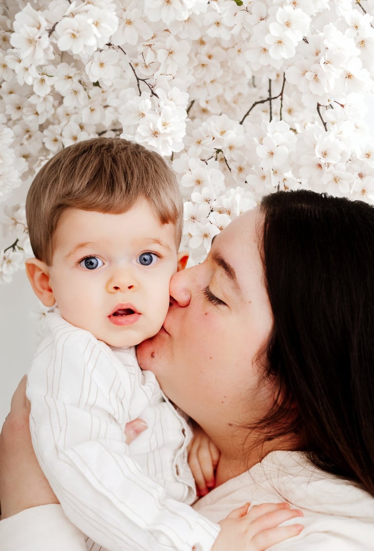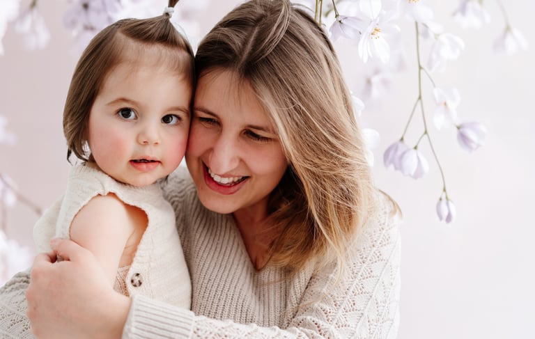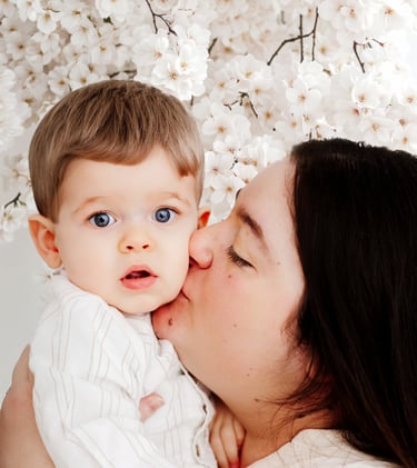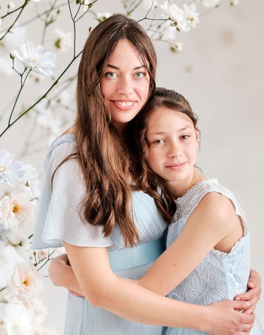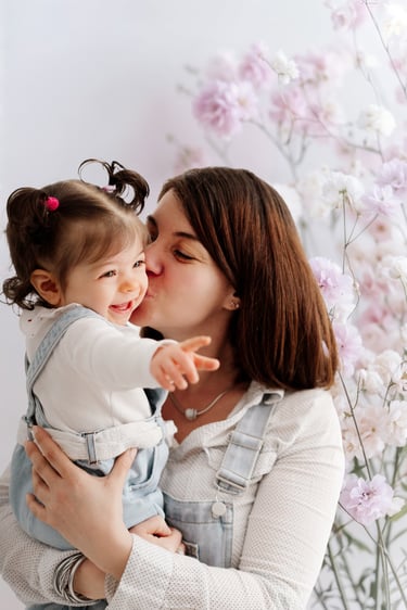 Divers fonds printaniers et délicats ont été choisi pour créer une ambiance douce et élégante, parfaite pour immortaliser les câlins et les regards complices entre une maman et ses enfants.