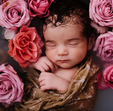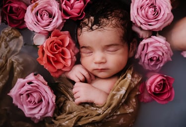 Je réalise un bain d'eau chaude + un soupçon de lait, afin d'y plonger votre tout petit enmailloté dans un lange. C'est un moment suspendu de calme et de lâché prise! Ce bain est agrémenté de fleurs fraîches, de feuillage, ou de rondelles d'agrumes, le tout dans une bassine ancienne.